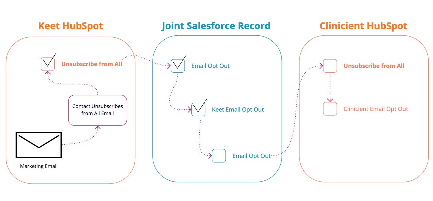 Leveraging Operations Hub Professional and Salesforce automation, we implemented a custom solution to separate unsubscribes so that unsubscribing from Keet Health marketing communications would not unsubscribe you from Clinicient's communications and vice versa.